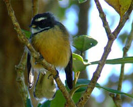 Fantail - Piwakawaka A fairly common bird the fantail has a long black and white fanned tail, a grey head with browny yellow underneath. This insect eating bird is inquisitive and relatively fearless. A familiar sight for bush walkers as it flits around the bush. |