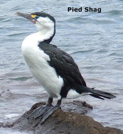 Pied Shag - Karuhiruhi Black above face from above the eye, underneath white, black thighs, grey bill, blue ring around eye, black feet. A coastal, sea fishing bird also found in estuaries and up rivers. Feeds large on fish diving in still water, shallows and currents. |