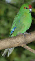 Kakariki Yellow-crowned parakeet and Red-crowned parakeet. The red-crowned Kakariki has a bright crimson forehead, crown and a streak through the eye, purple-blue on the wings and the yellow-crowned has a golden yellow crown. Kakariki have long tails and a yellow or red crown. Usually bright green in colour with long tails. They favour holes in branches and trunks of trees for nesting. |